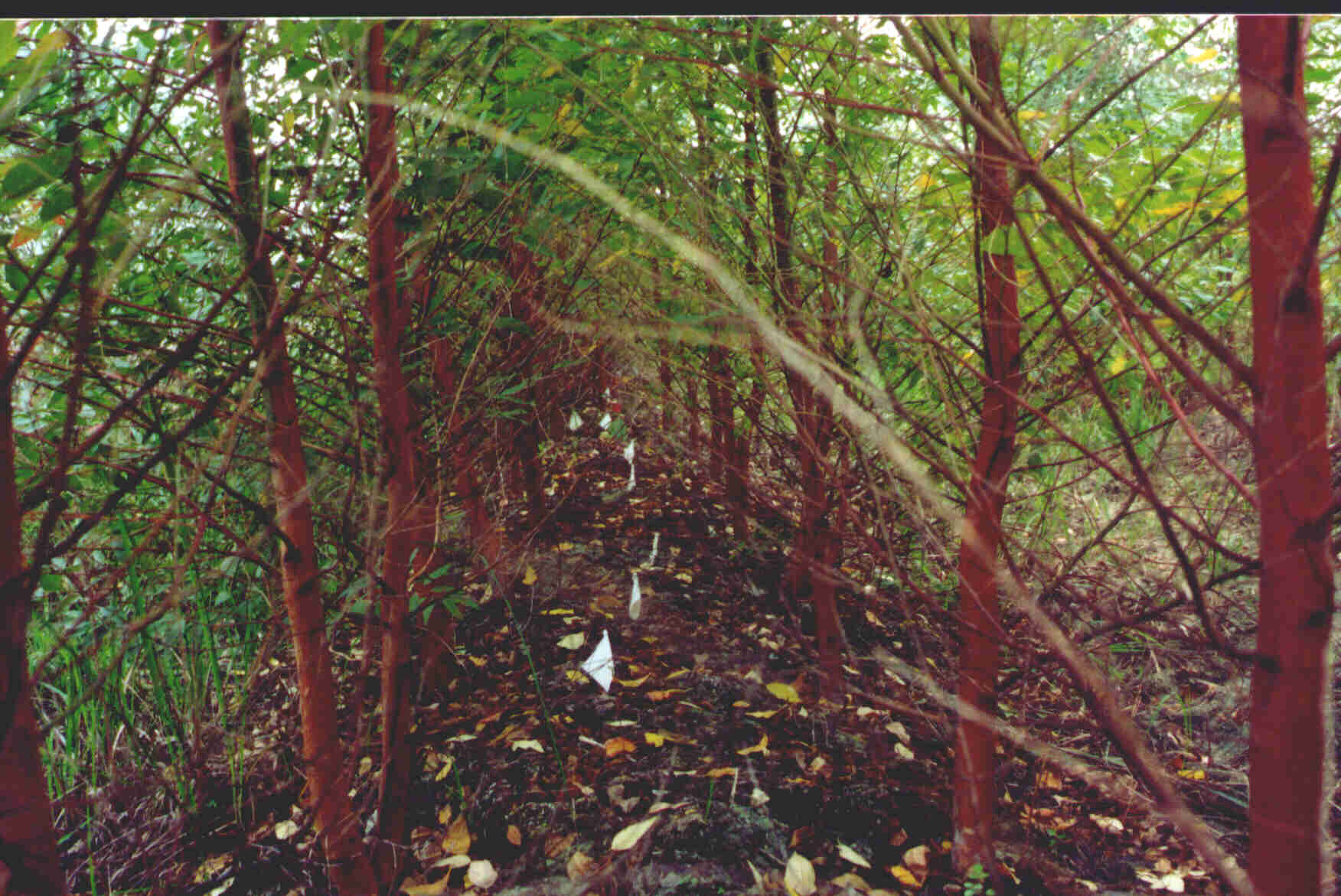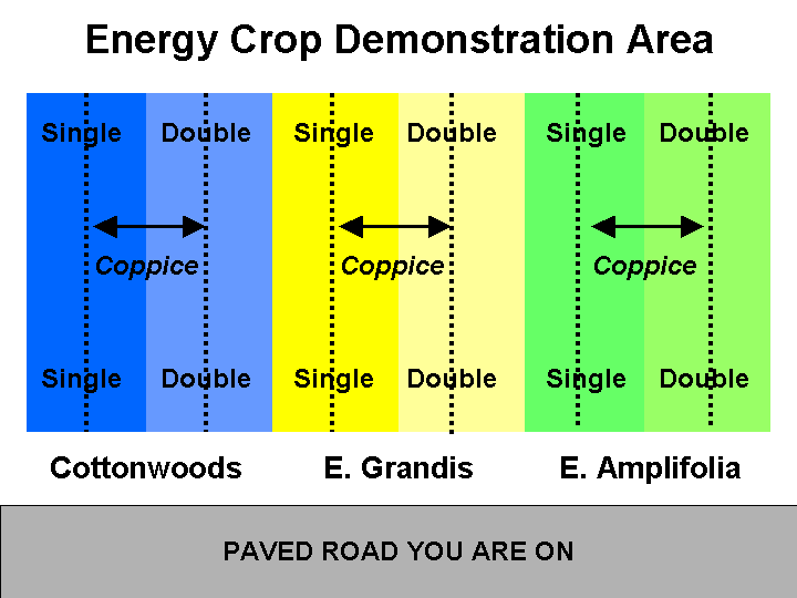 By the way, 60 years ago when this site was mined for phosphate, the paved road where you are standing was a 40 bart dam for a clay settling pond which is now our tree farm. Design of Demonstration Area:   As you look at the energy crop trees, you'll see that some trees are taller than others. We will explain this in a moment, but its important to know that all the trees you are seeing were planted at the same time in May 2001. The Demo Area has 12 research blocks: